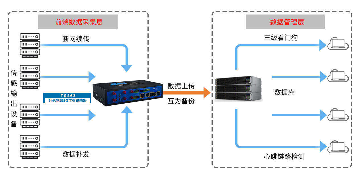 支持?jǐn)嚯姟嗑W(wǎng)續(xù)傳和數(shù)據(jù)自動(dòng)補(bǔ)發(fā),保證數(shù)據(jù)完整性;有線、無(wú)線網(wǎng)絡(luò)互為備份,降低通信故障概率;三級(jí)看門狗機(jī)制、心跳鏈路監(jiān)測(cè)保護(hù),保障數(shù)據(jù)穩(wěn)定完整傳輸。
