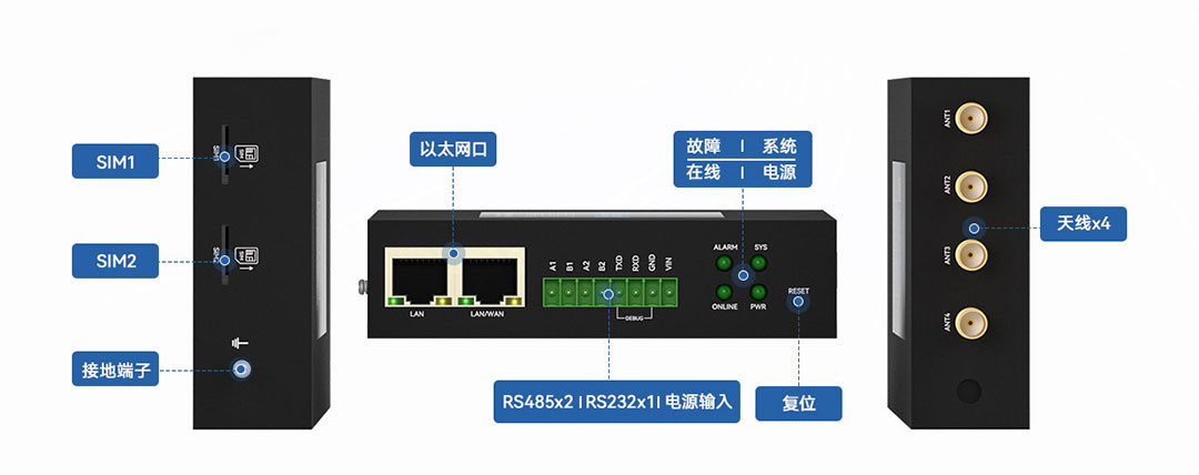 ★4*5G天線,1×LAN、1×WLAN/LAN、1×RS232(debug)、2×RS485。