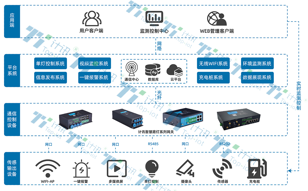 計(jì)訊物聯(lián)多功能燈桿網(wǎng)關(guān)建立桿體與遠(yuǎn)程控制中心的交互通道,連接控制器、傳感器、音頻設(shè)備等入網(wǎng),數(shù)據(jù)采集、存儲(chǔ)、傳輸、控制命令執(zhí)行,實(shí)現(xiàn)多功能燈桿智慧照明、視頻監(jiān)控、wifi覆蓋、環(huán)境氣象監(jiān)測(cè)、充電樁、信息發(fā)布等遠(yuǎn)程自動(dòng)化操作。