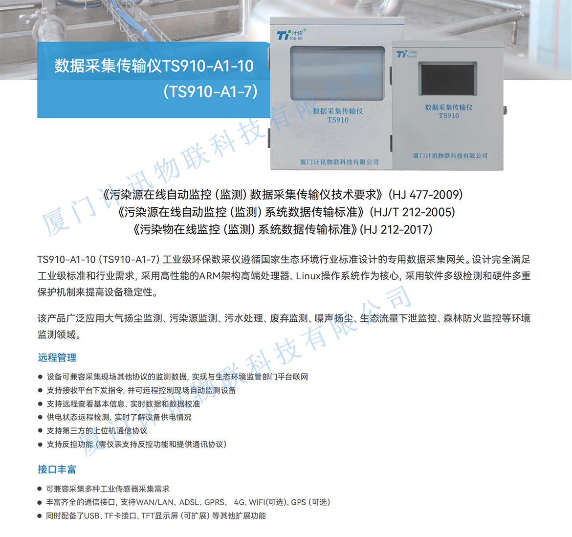 數(shù)據(jù)采集傳輸儀(箱體)| TS910-A1TS910系列環(huán)保監(jiān)測(cè)終端,豐富接口及協(xié)議,下行前端數(shù)據(jù)自動(dòng)采集、主動(dòng)上云,上行對(duì)接環(huán)保監(jiān)管部門、計(jì)訊智慧環(huán)保平臺(tái)、第三方定制平臺(tái),實(shí)... -