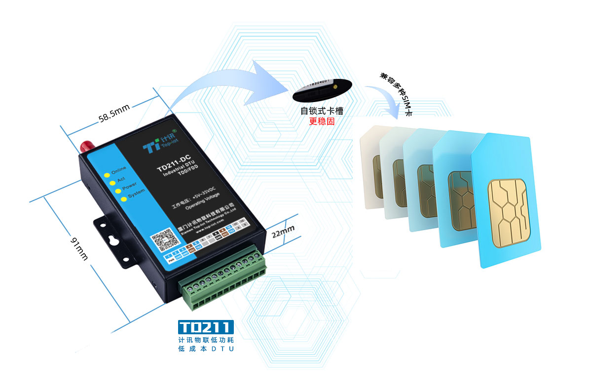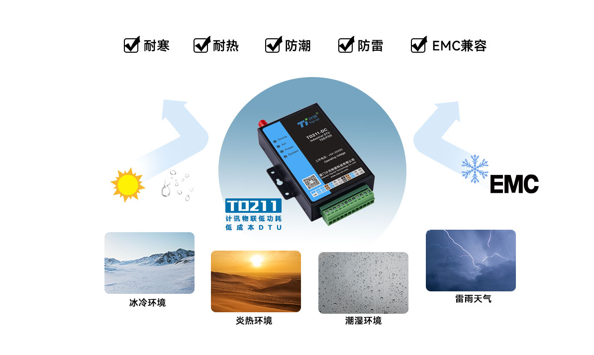 國產(chǎn)化DTU | TD210-C1計訊物聯(lián)國產(chǎn)化DTU TD210-C1,采用處理器國產(chǎn)化方案,主頻性能翻倍,功耗減半, 全網(wǎng)通5G 4G,4G CAT 1,支持串口與IP數(shù)據(jù)、IO與IP數(shù)據(jù)的雙向轉(zhuǎn)換,RS232接口、RS485接口、可選DI、ADC、PI接口,自愈 -