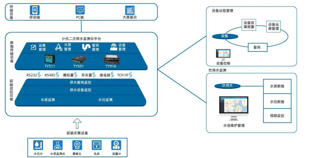 計(jì)訊物聯(lián)二次供水水池泵站監(jiān)測(cè)方案主要由前端采集設(shè)備、無(wú)線(xiàn)通信設(shè)備、二次供水監(jiān)控平臺(tái)系統(tǒng)等部分組成,由計(jì)訊物聯(lián)水利RTU接入供水設(shè)備機(jī)組傳感器、視頻安防、水位計(jì)、水質(zhì)監(jiān)測(cè)儀、液位傳感、電表、流量計(jì)、能耗監(jiān)測(cè)、流量監(jiān)測(cè)、環(huán)境監(jiān)測(cè)等設(shè)備,并為二次供水水池泵站監(jiān)測(cè)設(shè)備提供5G專(zhuān)網(wǎng),實(shí)時(shí)監(jiān)測(cè)與采集二次供水泵站內(nèi)的溫濕度、進(jìn)出水壓力、水流量、蓄水池水位、濁度、PH值等信息數(shù)據(jù)、監(jiān)測(cè)設(shè)備備的供電電壓、電流、電量、開(kāi)關(guān)等狀態(tài)以及水泵啟??刂?。