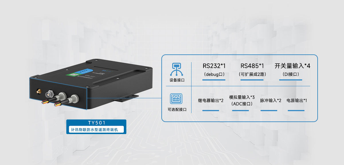 微型遙測(cè)終端機(jī) | TY501計(jì)訊物聯(lián)TY501系列RTU是一款集數(shù)據(jù)采集與2G 3G 4G數(shù)據(jù)傳輸功能于一體的微型水利數(shù)據(jù)遙測(cè)終端機(jī),采用極簡設(shè)計(jì)思路,實(shí)現(xiàn)水文水資源的關(guān)鍵數(shù)據(jù)采集、存儲(chǔ)與控制、報(bào)警與傳輸?shù)染C合功能。