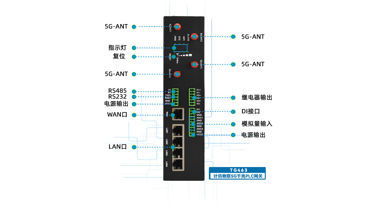 計訊物聯(lián)TG463是一款適用于 PLC設(shè)備遠(yuǎn)程聯(lián)網(wǎng)的5G PLC網(wǎng)關(guān),可實現(xiàn)PLC設(shè)備的遠(yuǎn)程監(jiān)控和數(shù)據(jù)透傳(遠(yuǎn)程調(diào)試、程序上下載)。實現(xiàn)遠(yuǎn)程配置和管理工業(yè)設(shè)備。支持第三方平臺接入,可連接SCADA軟件(WINCC、組態(tài)王、力控等)實現(xiàn)遠(yuǎn)程監(jiān)控。兼容西門子、三菱、歐姆龍、Modbus TCP等網(wǎng)口協(xié)議。