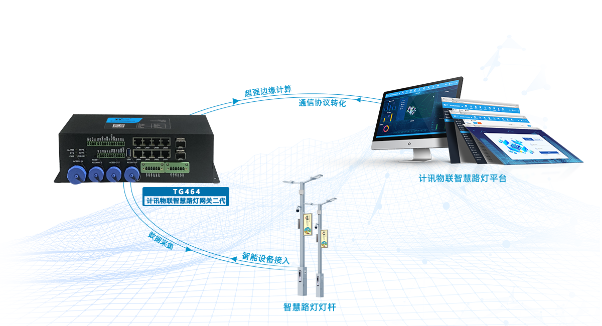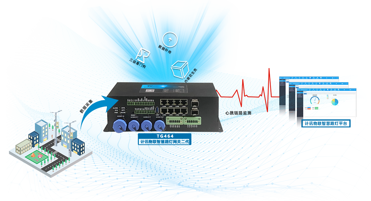 高標(biāo)準(zhǔn)城市照明智能化應(yīng)用,計訊物聯(lián)創(chuàng)新城市節(jié)能之光計訊物聯(lián)高標(biāo)準(zhǔn)城市照明智能化升級,自動化控制策略、平臺可視化、數(shù)字化孿生管理TG462集中控制器,基于ARM架構(gòu)和Linux系統(tǒng),具備軟硬件多重保護(hù)機制、多種通信能力、豐富的IO接口,為配電