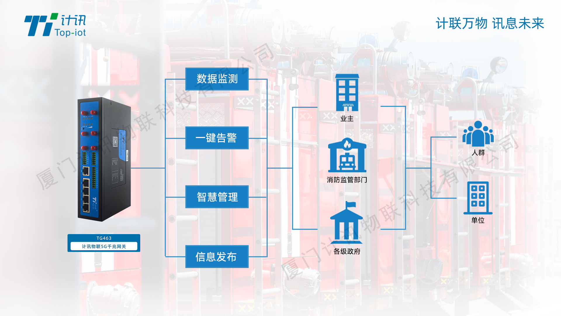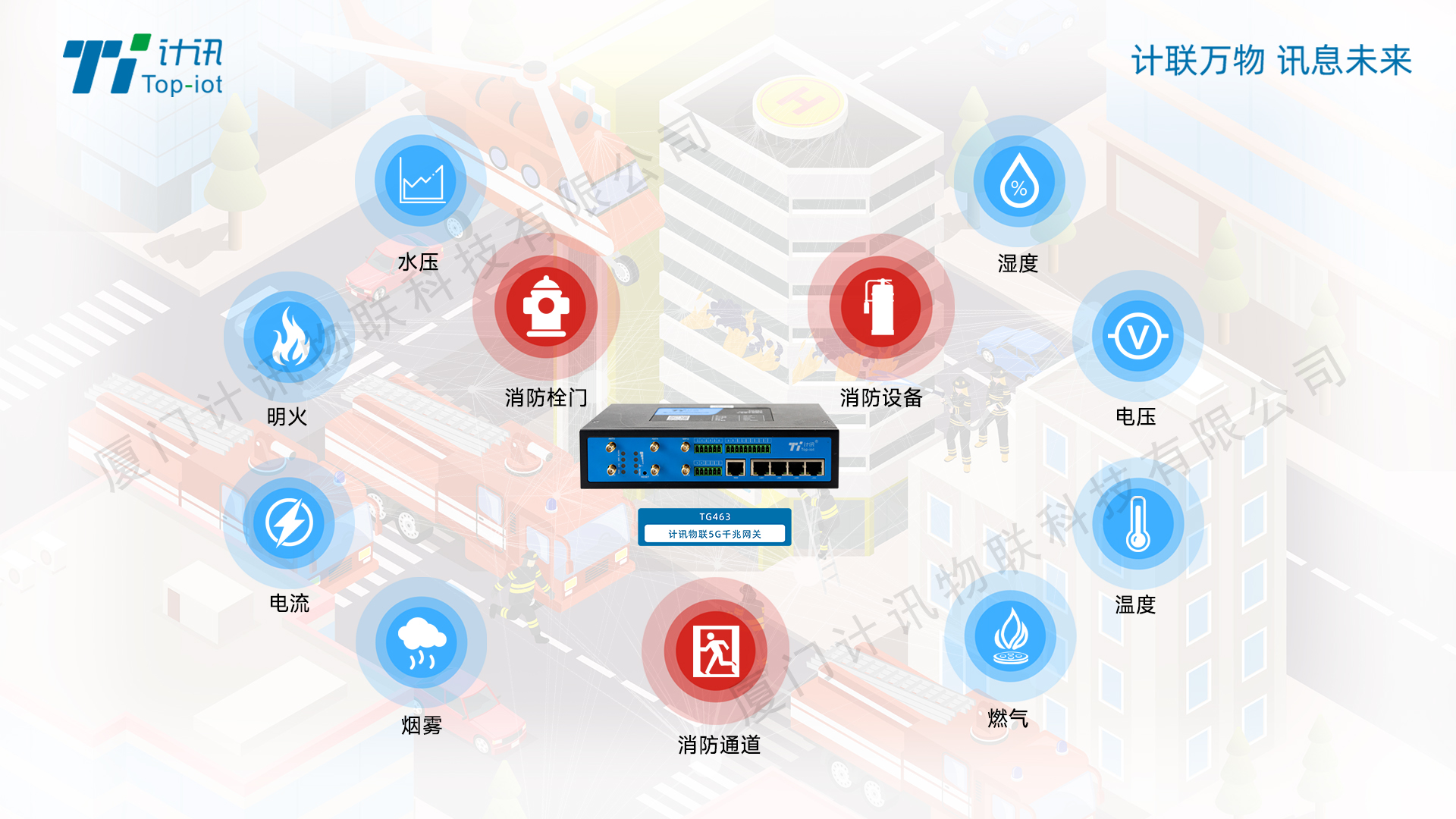 計訊物聯(lián)智慧消防解決方案針對火災特點集成5G千兆工業(yè)路由器以及無線燃氣報警器、無線壓力采集器、無線手動報警器、溫感報警器、火點報警器、液位監(jiān)控、煙感探測器、視頻監(jiān)控、水壓監(jiān)控、電力監(jiān)控、防火門監(jiān)控、應急廣播等前端感應設備,以此實現(xiàn)實時監(jiān)測、隱患管理等功能。
